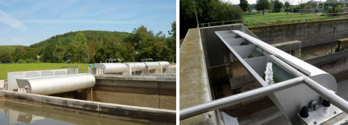 Процесс мойки ➞ Потенциальная энергия хранимой воды, выплеснутой из ковша, превращается в кинетическую энергию. На переднем крае водяной волны образуются высокоскоростные ударные волны и мощные приливы, которые направляются через изогнутые ступени на дне бассейна, омывают и переносят осадочные загрязнения на дно в водосборный отсек.